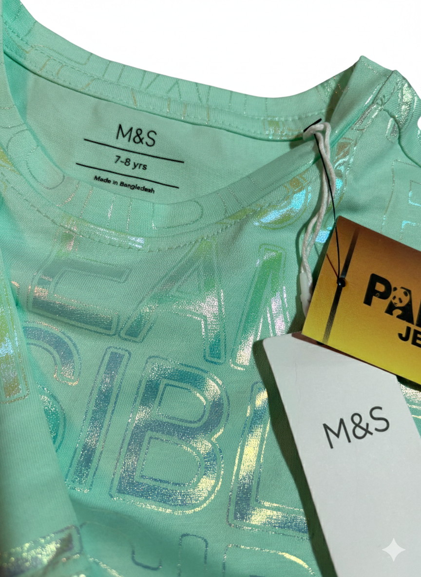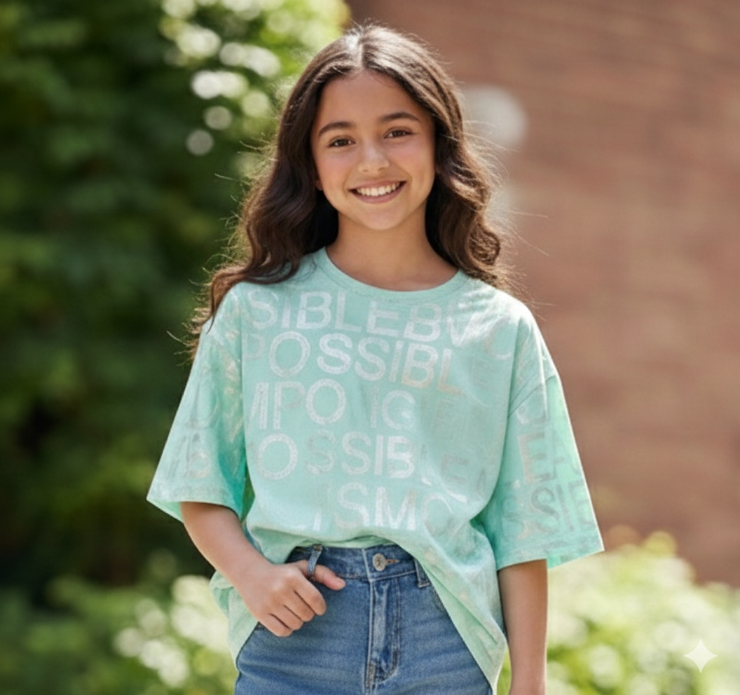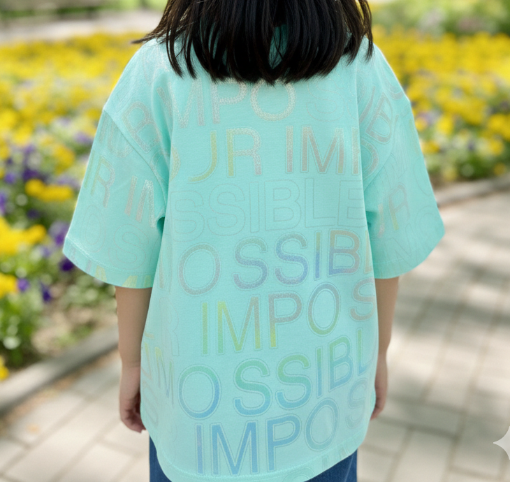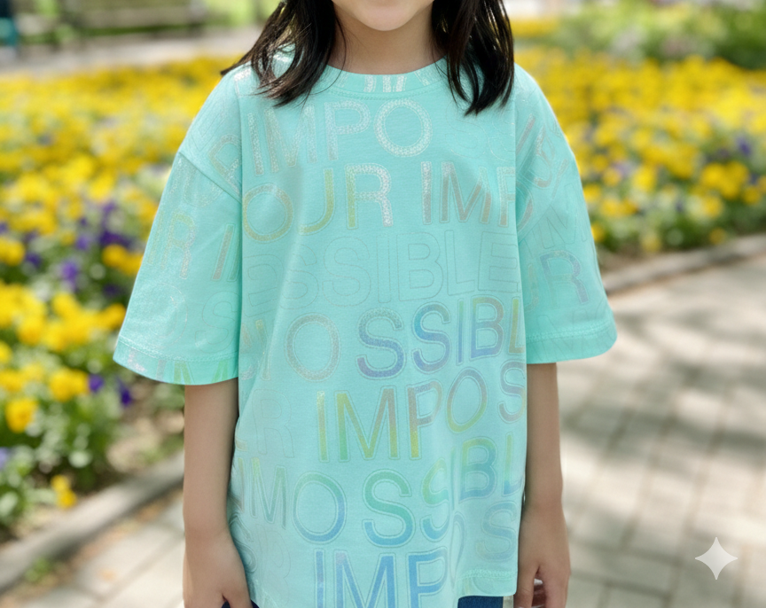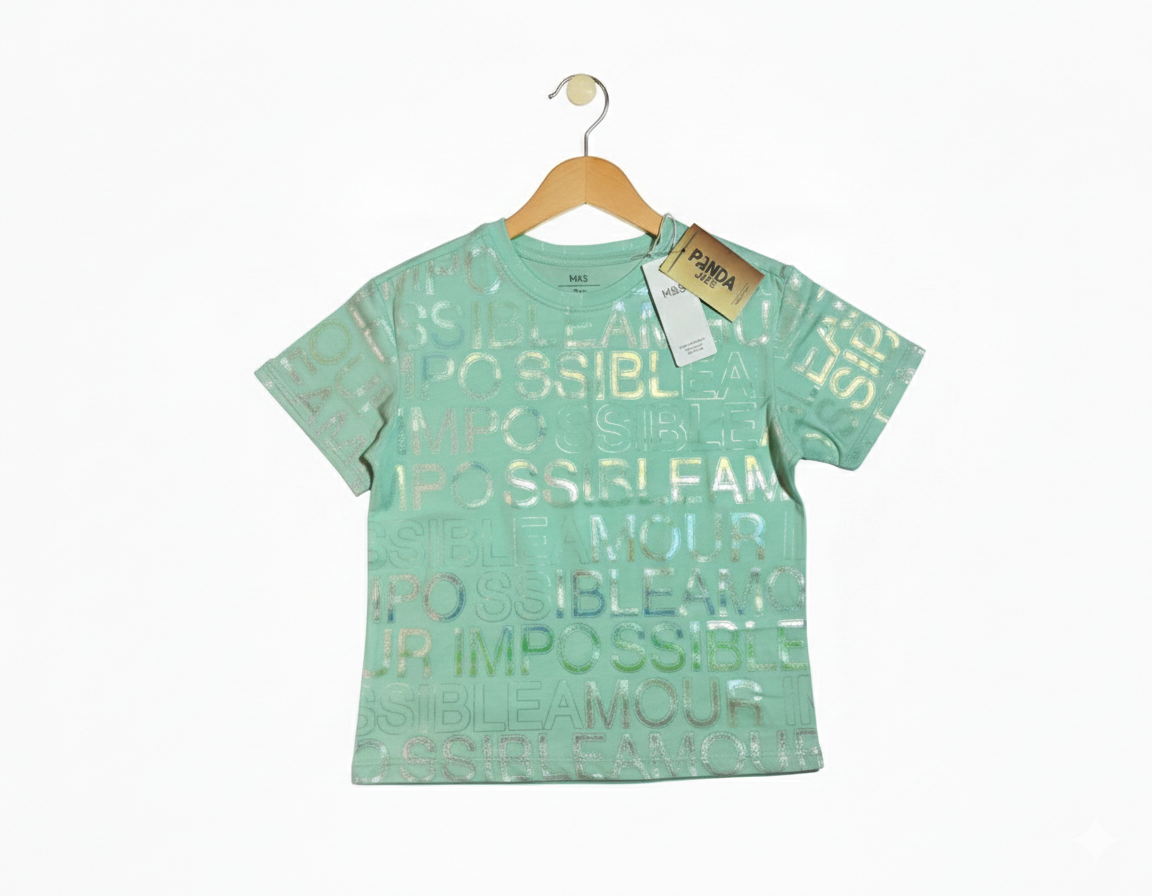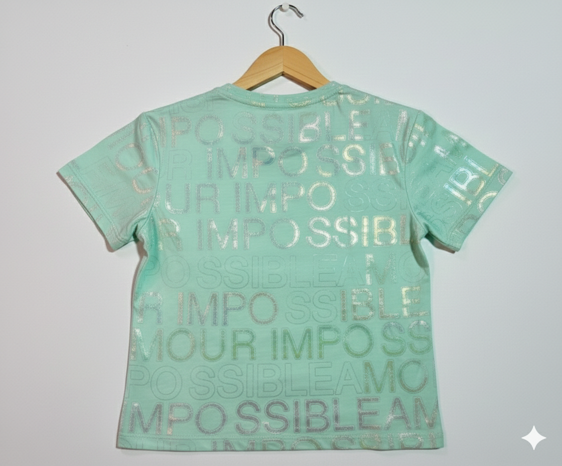 Make your style shine with this trendy Mint Green T-shirt. It features a cool holographic print with the words “Impossible Amour” all over the shirt. The metallic text changes color in the light, giving it a unique and fancy look.